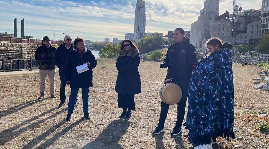 Just a few weeks ago, more than 30 Meet Minneapolis staff members participated in an experiential learning tour of sacred and significant land and water sites in Minneapolis and beyond. This Bdote tour is offered by the Minnesota Humanities Center. Bdote is a Dakota word that generally means “where two waters come together.” The bdote where Ȟaȟáwakpa (Mississippi River) and the Mnísota Wakpá (Minnesota River) come together is central to Dakota spirituality and history.