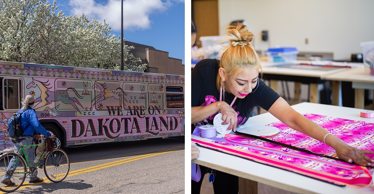 To that end, I recently have been following along with a local Anishinabe artist named Courtney Cochran who has been running community workshops partnering with the Minnesota Department of Transportation and the Native American Community Development Institute to paint panels that will eventually spell out “Never Homeless Before 1492,” in reference to Indigenous folks' lives before colonization. These panels will be installed along Franklin and Hiawatha avenues addressing the issue of homelessness among Indigenous folks that began with the forced removal of Native Americans due to Western expansion. This corridor once was the space of a large homeless encampment named “The Wall of Forgotten Natives” in 2018. Many factors have led to the homeless encampments throughout the city, but Angela Two Stars, a member of the Sissteon Wahpeton Tribe and director of the All My Relations Art Gallery, says she hopes that this installation will help to promote solutions and optimism.