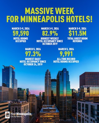 - The 9,991 hotel rooms occupied on Tuesday, March 5, were an all-time high for Minneapolis hotels, surpassing the 9,888 mark set twice in 2023 (June 13 & 23).